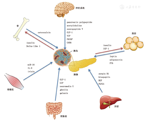 近年来关于脂肪、脑、骨与β细胞的研究进一步证实了胰岛多脏器间的协同作用。瘦素可通过下丘脑增加交感兴奋性,负性调控骨钙蛋白的生物活性,最终影响β细胞功能;而脂联素可降低交感兴奋性,对β细胞产生相反于瘦素的作用。多脏器间的相互交流与反馈,多角度多方面维系着胰岛功能的稳态。