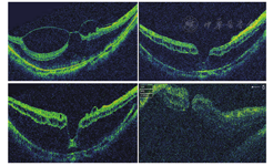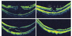 上图左术前OCT显示黄斑区劈裂并中心凹玻璃体视网膜牵引;上图右Phaco联合玻璃体切除并内界膜剥离术后3个月,中心凹牵引解除但黄斑劈裂仍持续。下图左术后6月可见中心凹出现脱离;下图右术后12个月出现黄斑裂孔视网膜脱离。