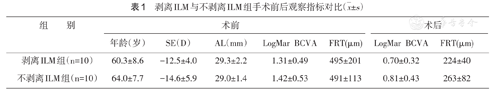 剥离与不剥离ILM组的平均年龄、SE、AL、术前LogMAR BCVA以及术前FRT之间的差异均无统计学意义,具有可比性(表1)。