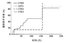 4组不同的CTE评分组在术后的累计再手术率的差异无统计学意义(P= 0.089),见图1。以CTE= 3为预测界值,预测术后复发再手术的灵敏度达90.5%,特异性为31.1%。