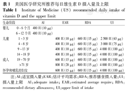 美国医学研究所(IOM)推荐了以骨骼健康为主的每日维生素D摄入量及其上限[34],见表1。