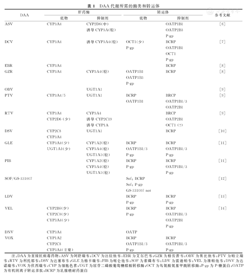 注:DAA为直接抗病毒药物;ASV为阿舒瑞韦;DCV为达拉他韦;EBR为艾尔巴韦;GZR为格佐普韦;OBV为奥比他韦;PTV为帕立瑞韦;RTV为利托那韦;DSV为达塞布韦;GLE为格卡瑞韦;PIB为哌仑他韦;SOF为索磷布韦;LDV为雷迪帕韦;VEL为维帕他韦;DNV为达诺瑞韦;VOX为伏西瑞韦;CYP为细胞色素;UGT为尿苷二磷酸葡萄糖醛酸转移酶;OCT为鸟氨酸氨基甲酰转移酶;P-gp为P-糖蛋白;OATP为有机阴离子转运多肽;BCRP为乳腺癌耐药蛋白