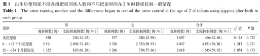 The urine training number and the differences began to control the urine control at the age of 2 of infants using nappies after birth in each group