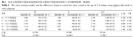 The urine training number and the differences began to control the urine control at the age of 2 of infants using nappies after birth in each subgroup