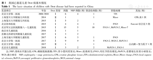 | 发表单位 | 年份 | Dent类型 | 例数 | NRP例数(例) | 肾活检例数(例) | 肾脏病理 | 其他(例) |