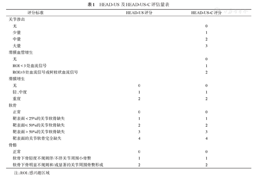 在HEAD-US[7]基础上,增加疾病活动性指标:关节渗出及滑膜血管增生。参照Melchiorre评分系统给予分级赋分(表1)。