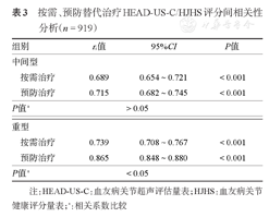 相关性分析见表3,按需、预防替代治疗组HEAD-US-C评分与HJHS评分存在正相关关系(P值均<0.05),中间型患者HEAD-US-C评分与HJHS评分的相关系数的95%CI在不同治疗组间有重合(P>0.05),相关性的差异无统计学意义。重型患者HEAD-US-C评分与HJHS评分的相关系数的95%CI在不同治疗组间不重合(P<0.05),相关性的差异有统计学意义,预防治疗组具有更强的相关性。