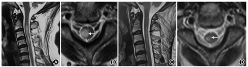 患者女性,59岁,主因"右颈部疱疹伴疼痛21 d,右肢麻木无力7 d"于2017年6月9日入院。患者于入院前21 d右颈部出现带状簇集性水疱伴烧灼、刀割样疼痛,当地医院诊断为"带状疱疹",予阿昔洛韦、甲钴胺、维生素B1口服,治疗后症状好转,局部疱疹结痂。入院前7 d无明显诱因晨起出现右肢麻木无力,上肢可抬起、能持轻物,下肢能站立及行走,伴头晕,无言语不清及饮水呛咳,无视物旋转,无头痛,无恶心呕吐,无视物成双,无耳鸣及听力下降,无大小失禁,无意识不清及肢体抽搐,未予诊治。患者于入院前1 d上述症状加重,右上肢不能持物,右下肢不能站立及行走,遂就诊于我院,查头颅MRI示未见新鲜梗死灶,给予疏血通治疗。治疗后患者症状无好转,为进一步诊治收入我科。患者自发病以来精神、饮食、睡眠可,无发热,进食水无呛咳,大小便如常。既往有冠状动脉粥样硬化性心脏病史6年,脑梗死病史1年。否认高血压、糖尿病、心房颤动、胃炎、青光眼等病史;否认肝炎、结核等传染病史;否认手术史;否认外伤及输血史。否认毒物接触史;近期无疫苗接种史;否认食物过敏史。吸烟40年,20支/d,无饮酒嗜好。入院时体检:体温36.5 ℃,脉搏93次/min,呼吸18次/min,血压120/78 mmHg(1 mmHg=0.133 kPa)。右侧颈后部可见散在红色皮疹及少许结痂。神经科体检:意识清楚,言语流畅,双侧瞳孔等大等圆,光反应(+),眼球运动可,眼位居中,无自发性眼震及复视,视力、视野粗测正常,眼底双侧视乳头边界清楚,动静脉比例2∶3,双侧鼻唇沟对称,伸舌居中,颈软,右上肢肌力Ⅲ级,右下肢肌力Ⅲ-级,左肢肌力Ⅴ级,肌张力正常,腱反射(++),双侧巴宾斯基征(+),右侧C4~T3针刺痛觉过敏,左侧肢体痛觉减退。化验血常规、凝血功能、肝功能、肾功能、电解质、心肌酶、血流变、尿常规、便常规未见明显异常。血脂:总胆固醇5.22 mmol/L(正常值0~5.18 mmol/L),LDL胆固醇3.45 mmol/L(正常值0~3.37 mmol/L),余未见明显异常。EB病毒DNA、巨细胞病毒DNA、单纯疱疹病毒DNA(血、脑脊液)检测均为阴性。血清免疫功能未见明显异常。血清及脑脊液水痘-带状疱疹病毒定性PCR法阴性。血清水痘-带状疱疹病毒抗体IgM阴性,血清水痘-带状疱疹病毒抗体IgG阳性。脑脊液涂片检查未见明显异常。脑脊液常规无色透明,潘氏试验阴性,总细胞数90×106/L,白细胞8×106/L。脑脊液生化未见明显异常。脑脊液细胞学涂片见个别淋巴细胞。细胞免疫荧光法(CBA法)检测血清AQP4抗体(亦称NMO-IgG)(+++)。颈椎MRI示C2~5水平髓内异常信号,建议增强检查(图1);C4/5、C5/6、C6/7椎间盘膨出。颈椎MRI增强示C2~5水平髓内异常信号,考虑炎性改变可能性大。自主神经功能检查示上下肢皮肤交感反射异常;R-R间期变化率未见异常。视觉诱发电位检查示双侧视路未见明显异常。胸片示主动脉硬化。颈部血管超声示颈动脉硬化,附壁斑块,右侧椎动脉开口处流速偏快。入院后予更昔洛韦抗病毒、神经妥乐平抗周围神经痛等对症治疗,予人免疫球蛋白35.0 g静脉滴注,连续5 d。予甲泼尼龙500 mg静脉点滴,1次/d,持续3 d,然后顺序递减。经治疗10 d,患者病情好转出院。患者出院后9个月随访,右上肢肌力Ⅴ-级,右下肢肌力Ⅴ-级,MRI示C2~4水平髓内异常信号,较前明显缩小。