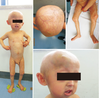 体格检查:身高78 cm,体质量8.5 kg(均小于中国儿童生长曲线第3百分位),指间距73 cm,坐高44 cm,头围47 cm,胸围43.5 cm,腹围37 cm,皮下脂肪厚度(肱三头肌)6 mm,皮下脂肪厚度(腹壁)2.5 mm。神志清楚,精神反应可,对答切题,声音尖细,下肢呈骑马样姿态。身材瘦小,全身皮肤变薄,皮下脂肪菲薄,颜色偏黑,头皮及四肢浅表静脉显露明显,躯干及四肢可见网状色素沉着斑和老年斑。全身皮肤触感硬,以躯干及双下肢为著。前囟已闭合,老人面容,头发及眉毛稀疏,额头突出,眼球突出,似鸟样外观,牙18颗,排列不整齐,下颌小,耳位不低,未见通贯掌。梨状胸廓,锁骨短小,双侧肋缘外翻,双肺及心脏听诊无异常,腹部触诊无异常,肝脾未触及肿大。四肢关节无法伸直,指、趾屈曲畸形,指甲甲板不平,趾甲甲板菲薄、凹陷、萎缩或缺失。神经系统查体未见异常。正常男童外生殖器,阴毛Tanner Ⅰ期(图1)。