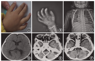 例1 患儿女性,3岁。因双眼流泪半年、加重伴视力显著下降2周,于2012年12月收入解放军兰州总医院。患者自幼双眼视力低于同龄儿童,曾经于2011年3月就诊当地医院,诊断为双眼角膜发育不良;药物治疗无效。1年前因生长发育迟缓及双手畸形于本院儿科诊断黏多糖贮积症1型(Hurler-Sheie综合征)。入院检查:患者一般情况良好,体重及发育情况与同龄儿无显著差异。四肢长骨远端膨大;胸部X线提示右侧肱骨上端略宽大,外科颈骨皮质不光滑,余骨质密度正常,未见骨质破坏及骨折征象;右侧尺挠骨远端干骨骺端宽大,略毛糙,见第1~5掌骨骨皮质扭曲;颅脑CT提示幕上脑室扩大(图1)。眼部检查:视力右眼0.05,左眼0.01,双眼不接受矫正;眼压右眼33mmHg(1 mmHg=0.133 kPa),左眼29 mmHg。双眼角膜全层中度混浊,角膜内皮轻度水肿,A超角膜测厚490~510 μm;前房轴深1.5~2.0 CT,虹膜纹理欠清晰,自然光线下瞳孔3~4 mm,对光反应略迟钝。患儿家长拒绝UBM检查。入院诊断:双眼继发性青光眼;黏多糖储积症。治疗策略:患者晶状体前后径显著增大,因此,给予患者硫酸阿托品眼用凝胶涂眼治疗,改善睫状肌张力。并给予布林佐胺滴眼液及盐酸贝他洛尔滴眼液点眼治疗,患者经过治疗后,眼压右眼20~24 mmHg,左眼19~23 mmHg,双眼角膜水肿改善;前房深度及眼轴长度始终无明显变化。