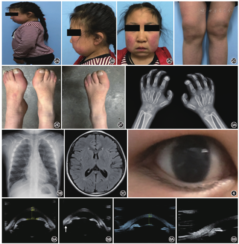 例2 患儿女性,11岁。因双眼视力差5年余,于2015年6月收入解放军兰州总医院。患儿自幼双眼视力低于同龄儿童,曾经于2005年就诊当地医院,诊断为双眼角膜发育不良;药物治疗无效。既往史:1年前因发育滞后我院儿科诊断为黏多糖贮积症1型。入院全身体检:身高110 cm,体重25 kg,颜面及颈项部均表现为典型的颅骨远端肥大,关节活动能力下降,颌面关节功能下降;脊柱前屈;而双侧手足关节及膝关节均表现关节远端肥大,功能下降,行走呈跛行步态(图2)。胸部X线提示右侧肱骨上端略宽大,外科颈骨皮质不光滑,余骨质密度正常,未见骨质破坏及骨折征象;右侧尺挠骨远端干骨骺端宽大,略毛糙,见第1~5掌骨骨皮质扭曲;颅脑CT提示幕上脑室扩大(图3)。患儿就诊时就读小学2年级,成绩中等,心理门诊及神经内科会诊提示:患者智商测量值105~120,智商低于同龄儿童,能胜任一般学习任务;儿科及内分泌科会诊意见:黏多糖贮积症1型。入院眼部检查:视力右眼0.12,左眼0.1,双眼不接受矫正;眼压右眼45 mmHg,左眼38 mmHg。双眼角膜全层中度混浊,角膜内皮皱褶(图4),前房轴深2~3 CT,虹膜纹理欠清晰,自然光线下瞳孔直径约3 mm,对光反应迟钝。应用UBM(图5)及眼球A超、角膜厚度等生理指数测量,患儿角膜厚度为0.537~0.562 mm,且角膜混浊水肿对Goldman压平式眼压测量结果影响并不大。双目眼底镜眼底检查模糊可见视盘及大血管,C/D为0.4~0.5,但很难拍照。由于儿童屈光间质混浊明显,其视觉电生理检查虽然表现为波幅下降及潜时延长,但不能单独证明视神经损伤情况,因此未予列出。入院诊断:(1)双眼继发性青光眼;(2)黏多糖贮积症。患者睫状体前位显著,周边房角狭窄但无明显关闭,小梁网结构范围密度增大,因此,给予患者硫酸阿托品眼用凝胶涂眼治疗,改善睫状肌张力。并给予布林佐胺滴眼液及盐酸倍他洛尔滴眼液点眼治疗,患者经过治疗后,眼压右眼(17.13±3.11)mmHg,左眼(16.09±2.67)mmHg,双眼视力提高,右眼0.25