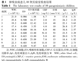 | 病例 | WBC(×109/L) | EO | EO绝对值(×109/L) | CRP(mg/L) | ESR(mm/1 h) | IgG(g/L) | IgM(g/L) |