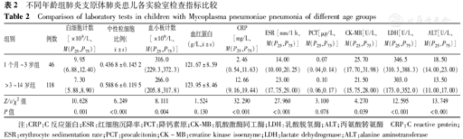 2组白细胞计数、中性粒细胞比例、血小板计数、CRP、ESR、ALT、CK-MB及乳酸脱氢酶(LDH)比较,差异均有统计学意义(均P<0.05);与1个月~3岁组比较,>3~14岁组中性粒细胞比例、CRP及ESR偏高,差异均有统计学意义(均P<0.01);1个月~3岁组白细胞计数、ALT、CK-MB及LDH相对升高更多见,差异均有统计学意义(均P<0.05)(表2)。