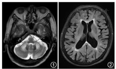FXTAS多在55岁以后发病,男性多见,病程逐渐进展,以意向性震颤、小脑性共济失调步态、帕金森症候群、认知功能减退、周围神经病及自主神经功能障碍为主要临床表现。通常意向性震颤最早出现且进展缓慢,可见于80%的患者,以手部震颤最明显,头部震颤也较常见。50%的患者可见小脑性共济失调步态,表现为站立不稳、步基增宽,一般晚于震颤出现;国外报道,患者多在病程9年左右时需依靠助行器行走,病程16年左右不能下床[6]。帕金森症候群见于30%的患者,临床症状较帕金森病轻,行动迟缓、身体僵硬更常见[2]。周围神经病变特点为长度依赖、感觉运动神经均受累、轴索损害为著。自主神经功能障碍表现为直立性低血压、性功能减退及尿频等。认知功能损害主要表现为执行功能减退。除此之外,还可能合并焦虑、抑郁、睡眠障碍、头痛、甲状腺功能异常、不宁腿综合征等症状[7]。颅脑MRI双侧小脑中脚对称性T2高信号为本病特征性的影像表现,可见于60%的男性患者及13%的女性患者[6]。皮质下白质病变也较常见,部分患者FLAIR序列可见胼胝体压部高信号[8]。治疗方面目前尚无特效药物可延缓或阻止此病的进展,临床上仅能对症治疗,如氯硝西泮、扑痫酮、阿罗洛尔等可减轻震颤,左旋多巴可改善帕金森样症状,平衡康复训练对步态不稳有效。另外,脑深部刺激也可减轻震颤,但可能加重共济失调症状[2,9]。