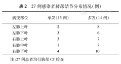 27例患者中8例出现发热,大多为低热,持续时间2~6 d,部分伴有乏力、全身酸痛、头痛等全身症状,按"病毒性上呼吸道感染"处理后热退,其余经胸部CT筛查阳性的患者均无特殊不适,1例出现皮疹,余无阳性体征。