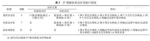 | 对症治疗组 | 7 | 无 | 氨溴索+桉柠蒎+脾氨肽(4周) | 3例3周完全吸收;2例4周完全吸收;2例随访过程中病灶先进展后吸收 |