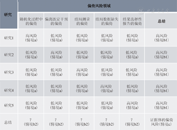 偏倚风险的评估是系统综述中必不可少的环节,包括对个体研究的整体偏倚风险评价(情境b1)以及某个评估领域的整体偏倚风险评价(情境b2)。这样的评价结果,既可以影响系统综述的分析过程(决定是否纳入排除、亚组分析、敏感性分析和Meta回归),也有助于对于某项研究的优势或者不足进行充分讨论。