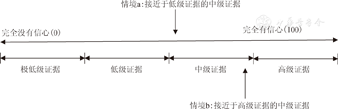 需要注意的是,在证据质量评价中,我们实际评价的是对证据的信心,这个信心类似于一个"连续型变量",但是GRADE系统要求我们做出的判断是一个"分类变量"(高、中、低和极低);同样是被评估为中等证据质量水平的证据,对于有的中等证据,我们虽然归为"中等"但是实际上我们可能认为这个证据质量已经几乎接近于低级证据了(图2中的情境a);而对于另外一些中等证据,我们对这些"中等证据"的信赖程度实际上要接近于高级质量的证据(图2中的情境b)。对于研究的偏倚风险的评价也类似,有的存在偏倚风险(some concern)的研究,实际研究质量整体水平可能接近一个虽然有些许瑕疵但是仍然被评为低偏倚风险的研究。不管是GRADE系统要求对证据体的偏倚风险做出的非常严重、严重和不严重的总体判断,还是利用某个特定的偏倚风险工具,例如RoB2.0版本[2],要求做出关于某个特定的研究的高偏倚风险(high risk of bias)、低偏倚风险(low risk of bias)或者存在偏倚风险(some concern)的判读,都是武断地、非精确地设置的分类变量,而不是真正反映现实世界中偏倚风险对结果影响程度由低到高的一个连续现象。