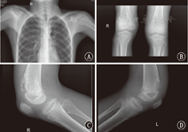 注:A:胸部正位片示双侧肱骨上段干骺端多发骨性突起;B:双膝关节正位片示双侧股骨下段干骺端、胫腓骨上段干骺端见骨质破坏,多发骨性突起,关节间隙未见狭窄;C:右膝关节侧位片示右侧股骨下段干骺端、胫腓骨上段干骺端见骨质破坏,多发骨性突起;D:左膝关节侧位片示左侧股骨下段干骺端、胫腓骨上段干骺端见骨质破坏,多发骨性突起 A:the chest X-ray showed that bilateral metaphysis of proximal humerus were multiple osseous protuberances;B:the bilateral knee joint X-ray showed that bilateral metaphysis of distal femur,proximal tibia and proximal fibula were bone destruction and multiple osseous protuberances,but there was no abnormality in the joint space;C:the right knee joint X-ray showed that right metaphysis of distal femur,proximal tibia and proximal fibula were bone destruction and multiple osseous protuberances;D:the left knee joint X-ray showed that left metaphysis of distal femur,proximal tibia and proximal fibula were bone destruction and multiple osseous protuberances