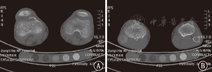 注:A:双侧股骨下端干骺端见多发点、条形高密度影,边缘多发骨性突起,不规则骨质破坏区,两侧髌骨及股骨远端骨骺边缘少许不规则骨质破坏、骨质增生硬化;B:双侧胫腓骨上段干骺端见多发点、条形高密度影,边缘多发骨性突起,及不规则骨质破坏区,双侧胫腓骨近端骨骺边缘少许不规则骨质破坏、骨质增生硬化 A:bilateral metaphysis of distal femur showed multiple point or striped high density shadow,multiple osseous protuberances at the edge and irregular bone destruction area.Both sides of the patella and the edge of the epiphysis of the distal femur showed a few irregular fracture damage,hyperosteogeny and osseosclerosis;B:bilateral metaphysis of proximal tibia and fibula showed multiple point or striped high density shadow,multiple osseous protuberances at the edge and irregular bone destruction area.Both sides of the edge of the epiphysis of proximal tibia and fibula showed a few irregular fracture damage,hyperosteogeny and osseosclerosis