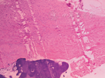 左侧股骨远端病灶活检术:术中见左侧股骨远端病灶处骨膜与骨皮质黏连,骨皮质变薄、表面粗糙,骨腔内病灶组织似玻璃软骨样组织。病理诊断:(左股骨远端)软骨瘤(图4)。出院诊断:双侧肱骨头、双侧髌骨、双侧股骨下端干骺端、双侧胫腓骨上端干骺端多发性软骨瘤。