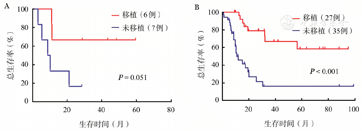 ETP-ALL与Non-ETP ALL患者的中位OS时间分别为11.33(95% CI 0~28.46)和25.69(95%CI 11.98~39.41)个月,3年OS率分别为41.7%和40.7%(P=0.699)(图1A)。两组患者的中位EFS时间分别为1.51(95%CI 1.23~1.79)和21.36(95%CI 4.67~38.04)个月,3年EFS率分别为16.7%和39.5%(P=0.002)(图1B)。ETP-ALL患者中最终有11例达CR,Non-ETP ALL患者中有57例达CR,3年RFS率分别为53.5%和52.0%(P=0.797)(图1C)。ETP-ALL患者中有6例(46.2%)进行了allo-HSCT,移植患者的中位OS时间尚未达到,未移植患者的中位OS时间为8.81(95%CI 2.93~14.68)个月,移植和未移植ETP-ALL患者的3年OS率分别为66.7%和16.7%(P=0.051)。Non-ETP ALL患者中有27例(43.5%)进行了allo-HSCT,移植患者的中位OS时间也尚未达到,未移植患者的中位OS时间为12.03(95%CI 4.88~19.17)个月,两组患者的3年OS率分别为66.7%和17.0%(P<0.001)(图2)。在所有T-ALL患者中,移植与未移植患者3年OS率分别为67.1%和15.5%(P<0.001)。