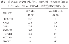 常见基因突变在早期前体T细胞急性淋巴细胞白血病(ETP-ALL)与Non-ETP ALL患者中的发生情况(%)