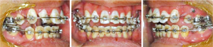 3.由0.019×0.025英寸镍钛方丝过度为0.019×0.025英寸不锈钢方丝,并用种植钉压低上、下颌后牙,逆时针旋转下颌及