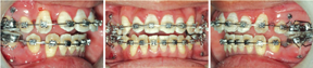 程度未进一步加重,我们提供给患者两个治疗方案:一是正畸-正颌联合治疗,二是正畸掩饰性治疗。患者最终选择方案二:减数拔除14、24、35、45;术中结合种植钉压低上颌下后牙,使支点前移、下颌逆时针旋转,同时内收上下前牙,纠正开