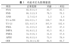 曲面断层片显示未见智齿、多生牙,未发现牙缺失,全口牙牙根发育正常,牙槽骨水平轻度吸收。头颅侧位片及头影测量分析(表1)显示:Ⅱ类骨面型,下颌后缩,上下前牙唇倾,下颌平面角大,面下1/3长,软组织凸面型。CBCT颞下颌关节截图显示双侧髁突表面骨皮质较为光滑,但左右髁突形状不对称,左侧髁突后斜面较平,右侧髁突—关节窝位置基本居中,左侧关节前间隙偏大,后间隙偏小(图1)。