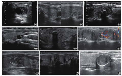 点状强回声较粗大钙化小,且无声影(图6D)。在甲状腺结节的实性成分中,它们可能对应于乳头状癌有关的砂粒体样钙化,因此认为是高度可疑恶性的,特别是与其他可疑征象并存,包括实性成分中伴有小彗星尾的点状强回声。