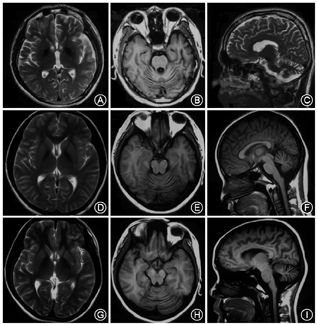 先证者二姐(Ⅱ3),22岁开始走路姿势稍异常,自小视力差,余无特殊;2018年1月25日随访时24岁,查体视力差,共济稍差,余无特殊。其于14岁时(无症状)于当地行头颅MRI检查结果回示:小脑萎缩(图2)。