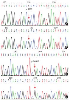 抽取该家系所有成员(Ⅰ1、Ⅰ2、Ⅱ1、Ⅱ2、Ⅱ3)及100名家系外正常个体外周血5 ml,经乙二胺四乙酸二钾抗凝,用标准方法提取DNA。采用全外显子测序技术对先证者(Ⅱ3)DNA进行测序,捕获目标突变位点(PLA2G6基因p.A80T和p.D331Y),并应用聚合酶链反应(PCR)对该家系的所有成员的DNA进行目标位点一代测序验证。PLA2G63号外显子引物序列:正义:5′CGTTAGTG- AGCGACCATGC3′;反义:5′TGATTCCAGCAGGG- ATGTG3′;7号外显子引物序列:正义:5′AGCTG- ACGATAGGAGGGAGAC3′;反义: 5′CTCAGAGCA- GAAGTGGCAGTG3′。PCR反应体系50 μl,包括:预混合酶25 μl,上、下游引物各4 μl(10 μmol/L),目的DNA 5 μl,去离子水13 μl。PCR反应条件:94 ℃预变性5 min,94 ℃变性30 s,退火30 s,72 ℃延伸1 min,共35个循环,72 ℃延伸10 min。PCR扩增产物纯化后送北京华大基因公司进行DNA测序。