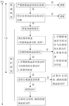 RIRS术后尿源性脓毒血症预后差,发生后应及时处理。术后血白细胞下降是脓毒血症的早期血液学表现,术后2 h内低于2.85×109/L是绝对敏感的警示指标,应立即给予液体复苏及抗生素干预。降钙素原能够预测70%尿源性脓毒血症的发生[7],比C反应蛋白、IL-6、乳酸有更高的特异性和敏感性,但是其升高要在2~6 h后出现;C反应蛋白在感染发生后6~8 h才明显升高,24~48 h达高峰,缺乏特异性。与SIRS相比,序贯性器官衰竭评分(SOFA)更加精确,能够有效地预测重症脓毒血症患者死亡率。呼吸频率≥22次/min、意识状态改变、收缩压≤100 mmHg三个指标共同组成了快速SOFA评分(qSOFA),有利于更加便捷、迅速地评估感染的严重程度及预后[8]。一旦患者出现寒战、高热、呼吸心率加快、低血压等脓毒血症的早期征兆(感染+SOFA≥2),应在1 h内实施抢救,在6 h内解除感染性诱因(图1)。液体复苏是脓毒血症的首要治疗措施,血液动力学不稳定者应在3 h内给予30 ml/kg晶体液;同时应用去甲肾上腺素维持平均动脉血压在65 mmHg以上。及早使用敏感抗生素是改善感染性休克预后的关键,每延迟1 h,存活率就会降低7.6%。