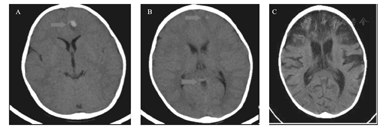 A:入院当天头部CT示左侧额叶多发斑片状高密度影,周围见片状稍低密度影,左侧额叶多发出血灶;B、C:第27天头部CT示双侧额叶、顶叶、左侧颞叶见大面积低密度影,内散在点片状稍高密度影;左侧丘脑、双侧基底节区散在点片状低密度影;双侧侧脑室、第三脑室扩张。双侧基底节区腔梗。