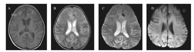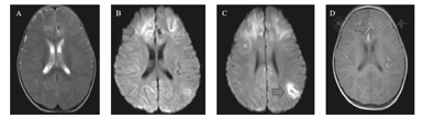 脑炎在MRI检查时可以表现为正常或弥漫性水肿或炎症性改变。EB病毒脑炎有脑炎样的症状,同时MRI检查可有出血表现。由于EB病毒易侵犯深髓质核,在影像学上可见多发的半球皮质、脑干、丘脑及基底节T2加权及FLAIR的高信号影[19],慢性EB病毒感染及神经系统病变复发时很少存在广泛性大脑白质的损伤[1,20]。头MRI对于检测此类颅内病变敏感性最高。Hashemian等[21]报道1例10岁女孩EB病毒脑炎,表现为意识障碍、行为异常、惊厥及排尿中断,步态不稳及颈强,脑脊液病毒阴性,血清学EB-VCA阳性,脑电图示慢波,头MRI提示基底节FLAIR呈现高信号,脑内病变为弥散受限高信号影,由此除外血管病变及中风,给予对症治疗,6周后语言及运动功能逐渐恢复。此患儿先后2次头MRI检查显示额、颞、顶叶多发斑片状长T1长T2信号,左侧额叶见小斑片样高T1低T2信号影,DWI图示脑内病变为弥散受限高信号影。脑电图结果为周期性尖波和慢波改变,有助于对脑炎的诊断,但脑电图诊断的特异度相对较低[22]。