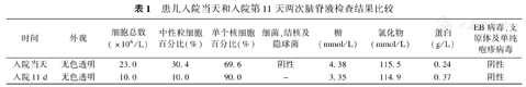患儿入院当天和入院第11天两次脑脊液检查结果比较