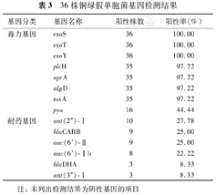 36株铜绿假单胞菌中,有15株(41.67%)只携带毒力基因,其中7株(19.44%)携带8种毒力基因,7株(19.44%)携带7种毒力基因,1株(2.78%)携带5种毒力基因;其余21株(58.33%)铜绿假单胞菌除携带6~8种毒力基因外,分别还携带1~4种耐药基因,见表4。