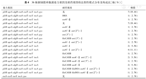 36株铜绿假单胞菌毒力基因及耐药基因检出阳性模式分布及构成比[株(%)]