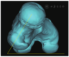 ②膝关节扭转角:将重建模型进行旋转,使胫骨平台后缘连线处于水平位置,胫骨平台后缘切线与股骨内外髁后缘切线的夹角即为膝关节扭转角(图2)。
