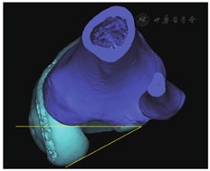 ③胫骨外旋角:将重建模型进行旋转,使胫骨平台后缘连线处于水平位置,胫骨平台后缘切线与内外踝中点连线的夹角即为胫骨外旋角(图3)。