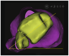 ①股骨前倾角:将重建模型进行旋转,使股骨后髁连线处于水平位置;确认股骨头中心点和股骨颈中心点,股骨头中心点和股骨颈中心点的连线与股骨内外髁后缘切线的夹角即为股骨前倾角(图1)。