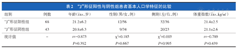 "J"形征阳性组与"J"形征阴性组患者年龄、性别、侧别、体重指数的差异无统计学意义(表2)。