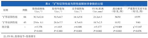 本研究样本量不是很大,可能会影响到某些结论的准确性,如胫骨外旋角与"J"形征的相关性。其次"J"形征的分度不够客观,这可能是基于体征的分度必然存在的问题。在后续的研究中,我们将进一步探讨"J"形征量化的可能性,通过更加准确、客观的方法来对"J"形征进行分度。
