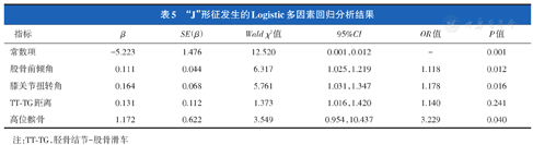 将单因素分析显示差异有统计学意义的四个变量(股骨前倾角、膝关节扭转角、TT-TG距离和高位髌骨)纳入Logistic回归分析。结果显示股骨前倾角增大、膝关节扭转角增大和高位髌骨是髌骨轨迹"J"形征发生的危险因素(表5)。