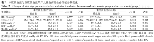 | 生命体征 | 中度贫血组(17例) | t/U值 | P值 | 重度贫血组(54例) | t/U值 | P值 | ||