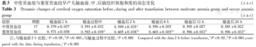 中度贫血组与重度贫血组早产儿输血前、中、后脑组织氧饱和度的动态变化 (