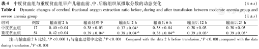 Dynamic changes of cerebral fractional oxygen extraction ratio before,during and after transfusion between moderate anemia group and severe anemia group (