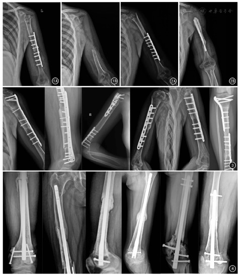 愈合组7例患者平均骨愈合时间15~43(27.0±10.5)个月,其中男3例、女4例,年龄14~42岁,异体骨长度9~20 cm;钢板螺钉内固定6例,髓内针内固定1例。均接受化疗。见表1。