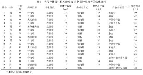 | 17 | 男 | 12 | 骨肉瘤 | 左肱骨 | 16 | 钢板 | 感染后取出异体骨 | 40 |
